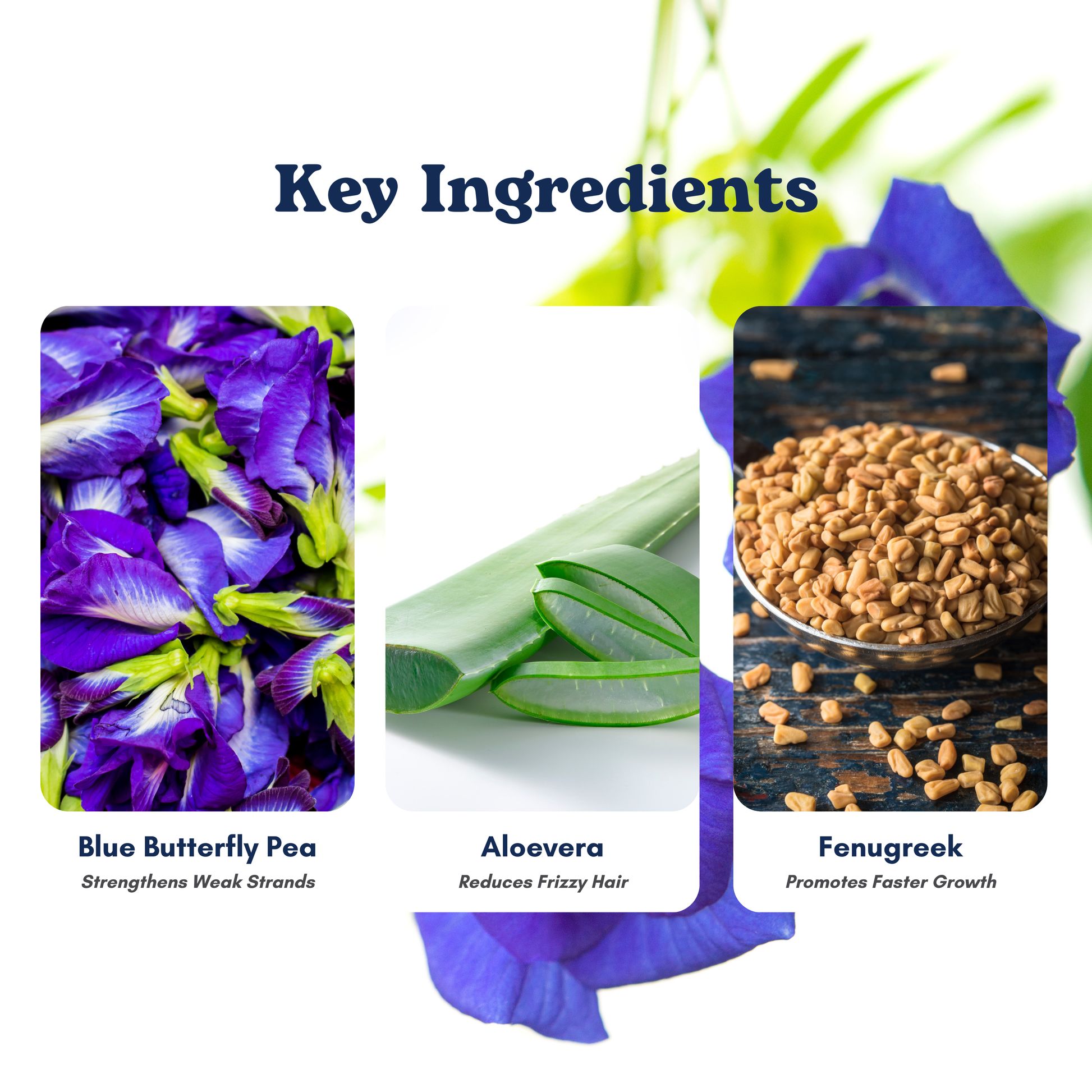 Butterfly Pea Flower is rich in anthocyanins that help improve blood circulation in the scalp and may slow down early greying.