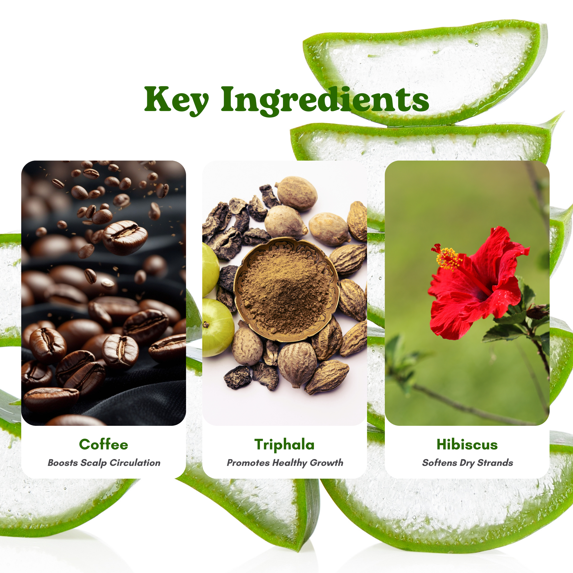 Amla, Hibiscus flower, Tulsi, Henna leaves, Barley, Brahmi, Neem leaves, Orange, Shikakai