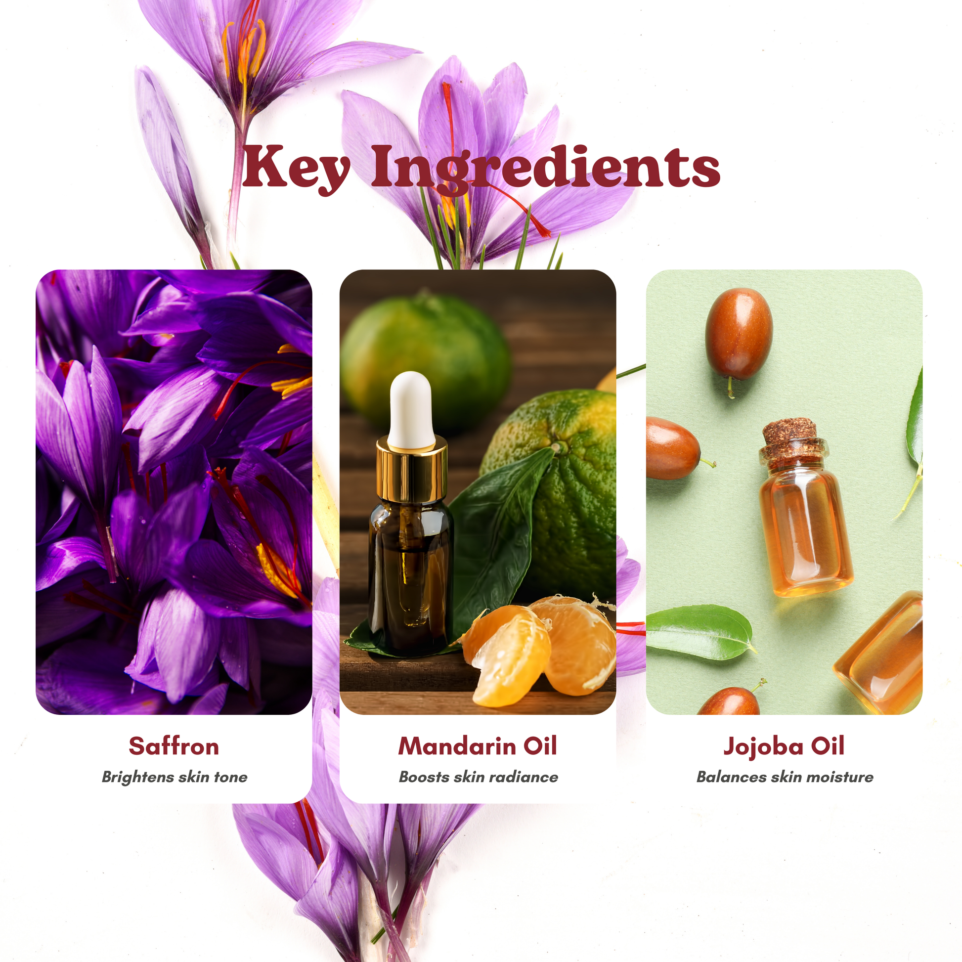 The powerful blend of Saffron and Kumkumadhi Oil rejuvenates tired skin, restoring its healthy, youthful glow.